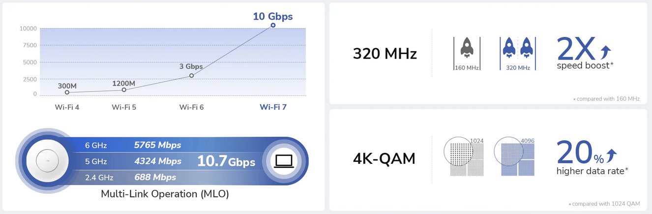 - Dual-Band Wi-Fi 7 (802.11be) - 688 Mbps (2.4 GHz) + 4320 Mbps (5 GHz) + 5760 (6 GHz)