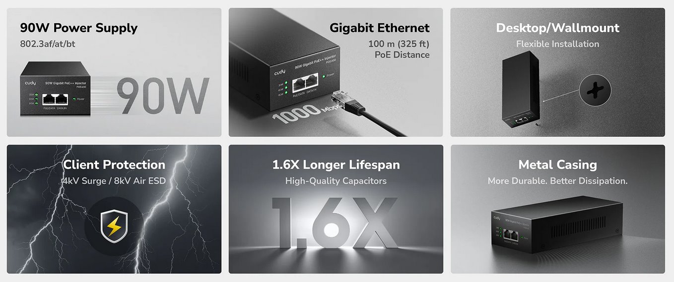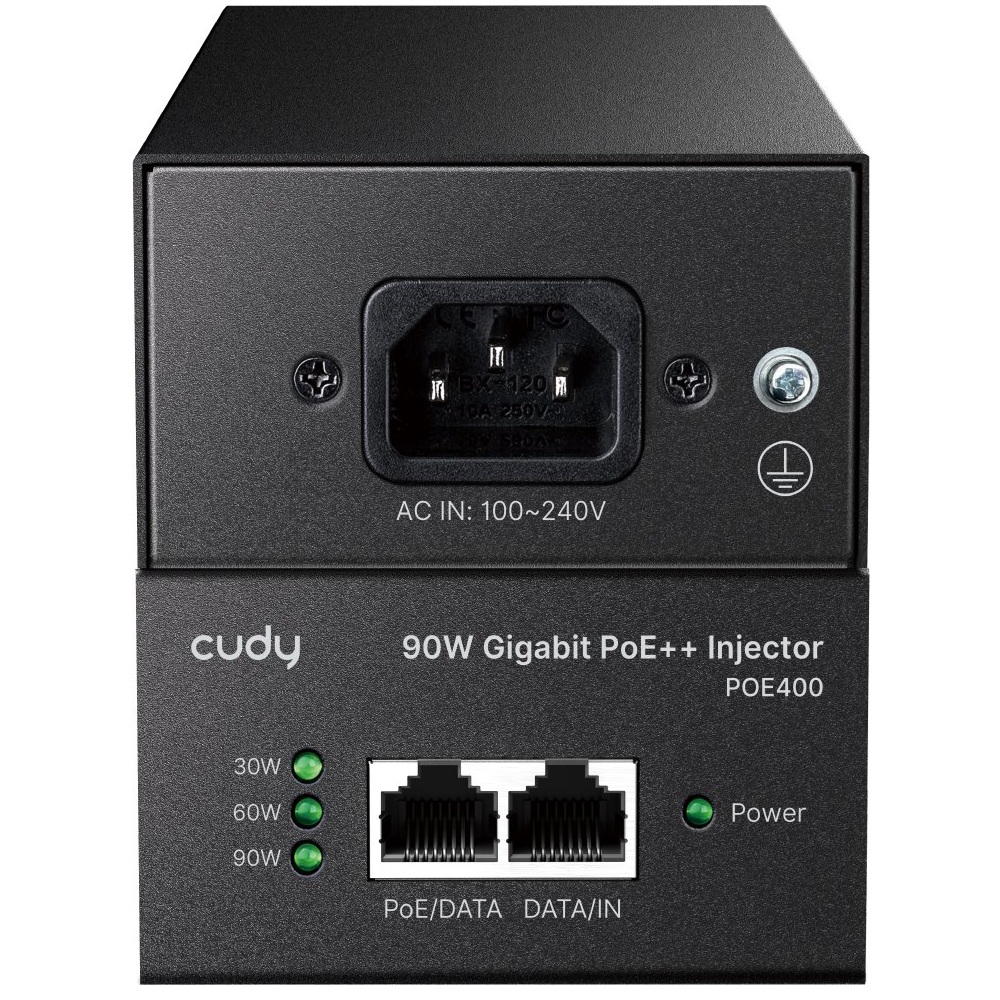 Výkonný PoE injektor značky Cudy umožňuje přenos napájení i dat až do vzdálenosti 100 metrů s podporou rychlostí 10M/100M/1G. Díky standardům 802.3af/at/bt poskytuje až 90 W výkonu přes čtyři páry vodičů a je tak ideální pro napájení náročnějších zařízení, jako jsou IP kamery, přístupové body, VoIP telefony či síťové switche. Kovové pouzdro s možností montáže na stěnu zajišťuje dlouhou životnost a spolehlivý provoz. Přehledné LED diody indikují napájení a zatížení PoE portu.