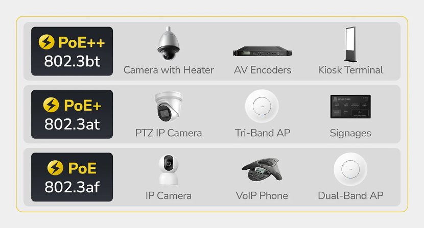 Podporované PoE-Out standardy: 802.3af, 802.3bt, 802.3at