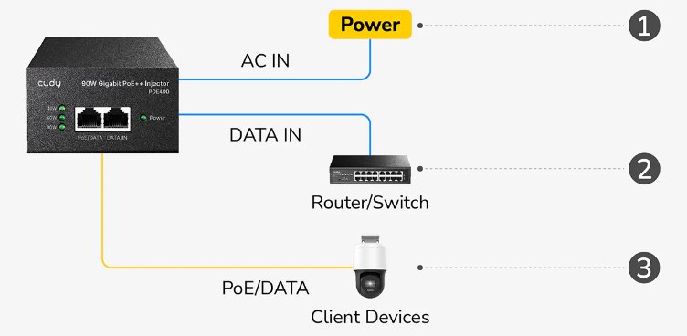 Výkonný PoE injektor značky Cudy umožňuje přenos napájení i dat až do vzdálenosti 100 metrů s podporou rychlostí 10M/100M/1G. Díky standardům 802.3af/at/bt poskytuje až 90 W výkonu přes čtyři páry vodičů a je tak ideální pro napájení náročnějších zařízeníVíce
