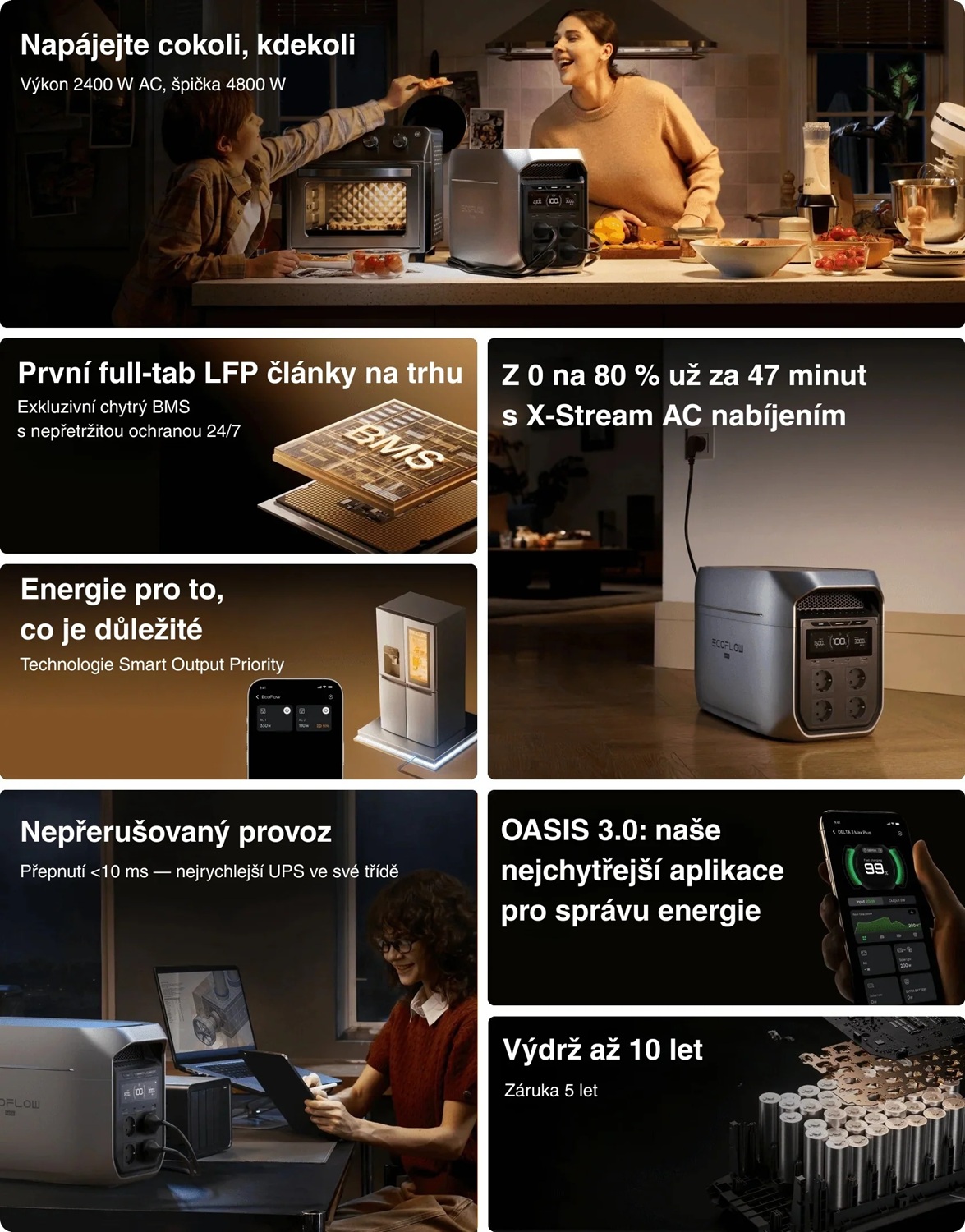 DELTA 3 Max může sloužit rovněž jako záložní zdroj pro nepřetržité napájení důležitých spotřebičů při výpadcích elektrické sítě, a to s rychlostí přepnutí 10 ms.
