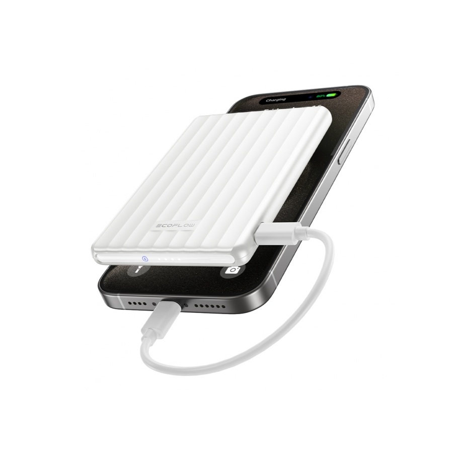 Magnetická powerbanka EcoFlow RAPID Mag Power Bank 5K se díky své velmi úsporné konstrukci a nízké hmotnosti snadno vejde i do kapsy kalhot a její zásoba energie tedy může být stále na dosah. Mobily může nabíjet i bezdrátově nebo pomocí USB-C portu.