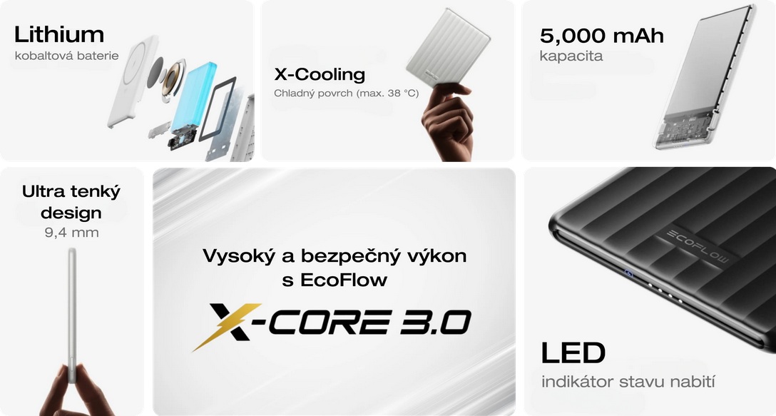 Základem této powerbanky je lithium kobaltová baterie a díky originální technologii EcoFlow X-Cooling sleduje teplotu připojeného telefonu a drží jej pod 38°C, čímž prodlužte životnost baterie. Powerbanka má čtyři LED diody sledují stav baterie v reálném čase.