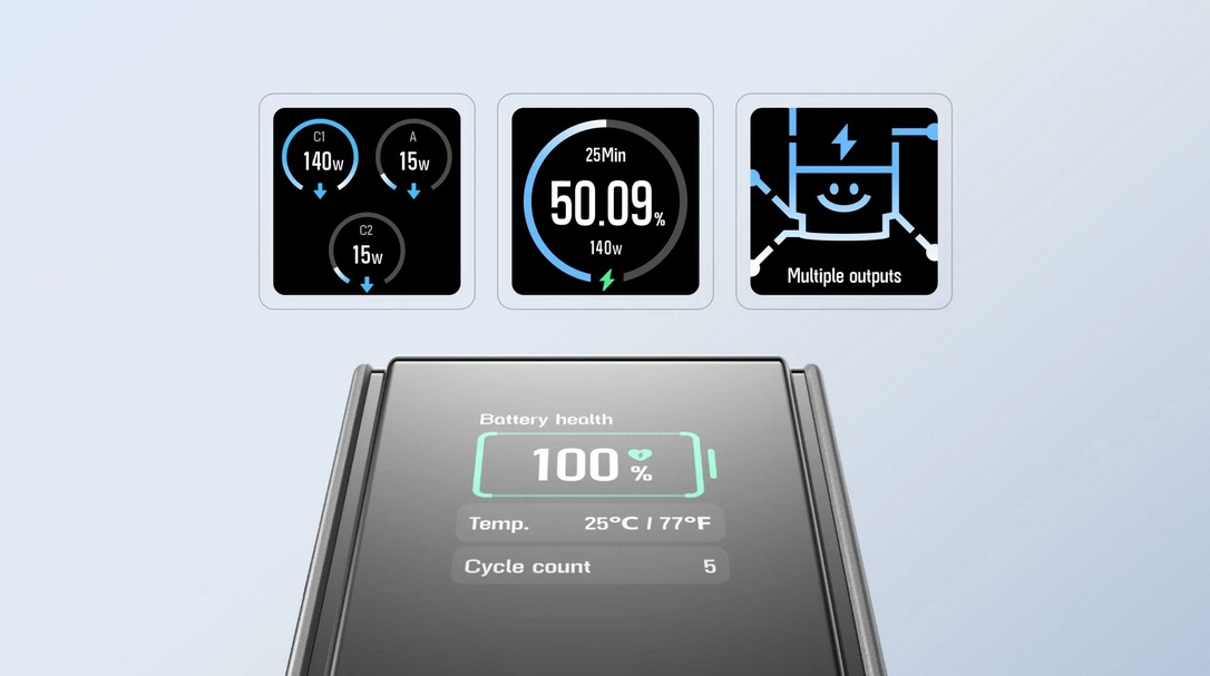 Dokáže nabíjet současně tři zařízení a to kombinovaně až 170 W celkově. Powerbanka disponuje 2x USB-C, které umí samostatně zásobovat zařízení výkonem až 140W. K dispozici je také USB-A, které samostatně nabízí výkon až 33W. Unikátní je rychlost nabíjení Powerbanky Rapid 25000mA, dokáže se nabít z 0-80% za pouhých 37 minut.