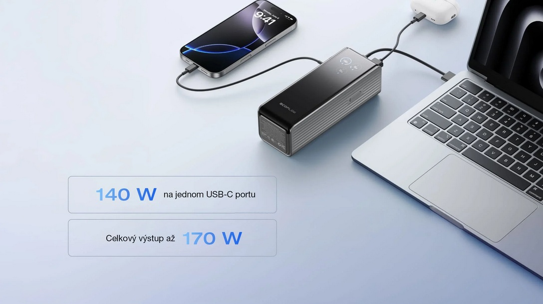Dobíjení přes (USB-C) 140 W, nabíjení více porty není podporováno, max. vstup jednoho USB-C portu je až 140 W