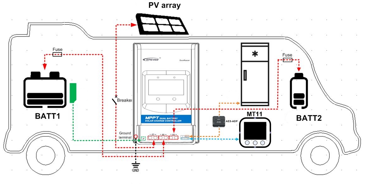 MPPT regulátor nabíjení DuoRacer je určen k nabíjení dvou baterií – palubní i startovací (znázorněných níže jako BATT1 a BATT2) v solárním systému. Tento regulátor podporuje několik typů hlavních baterií (BATT1), včetně uzavřených, gelových, zaplavených, LiFePO4 a Li-NiCoMn baterií, které jsou vhodné pro RV, karavany, lodě atd. Zařízení automaticky rozpozná napětí systému baterie startéru (BATT2) a po splnění podmínek se baterie dobije.