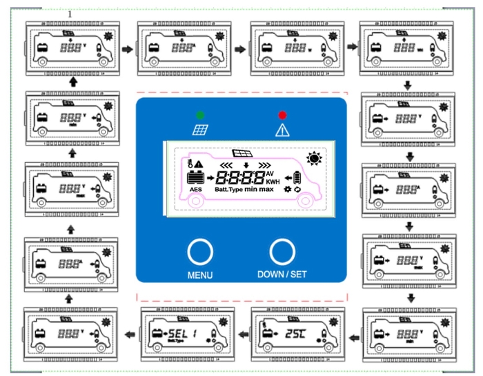 Smyčka displeje: FV napětí › FV proud › FV energie › Generovaná energie › Napětí BATT1 › Proud BATT1 › Max. napětí BATT1 › Min. napětí BATT1 › Teplota BATT1 › Typ baterie BATT1 › Napětí BATT2 › Proud BATT2 › Max. napětí BATT2 › Min. napětí BATT2 › FV napětí
