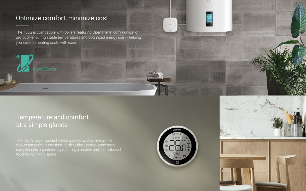 Sada T56 Smart Thermostat Kit kombinuje termostat T56T s domácí bránou T56G pro přesné řízení teploty kotle a zajištění komfortního vnitřního klimatu. Systém je navržen pro snadnou instalaci a intuitivní ovládání s možností vzdáleného řízení přes mobilní aplikaci EZVIZ.