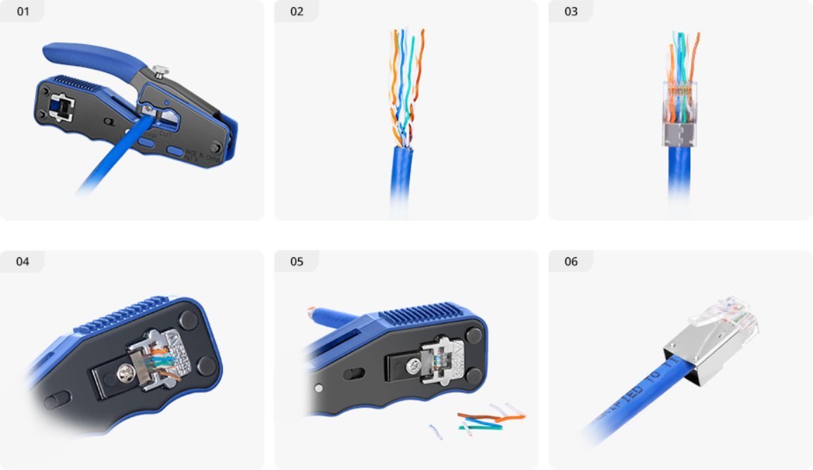 Moderní průchozí konektor RJ45 výrazně zjednodušuje vydělávání hrotu, což umožňuje úplné protažení žil přes zástrčku. Díky průchodu jsou žíly rovnoměrně uspořádány, instalatér získá vizuální kontrolu pořadí uspořádání žil před utažením.