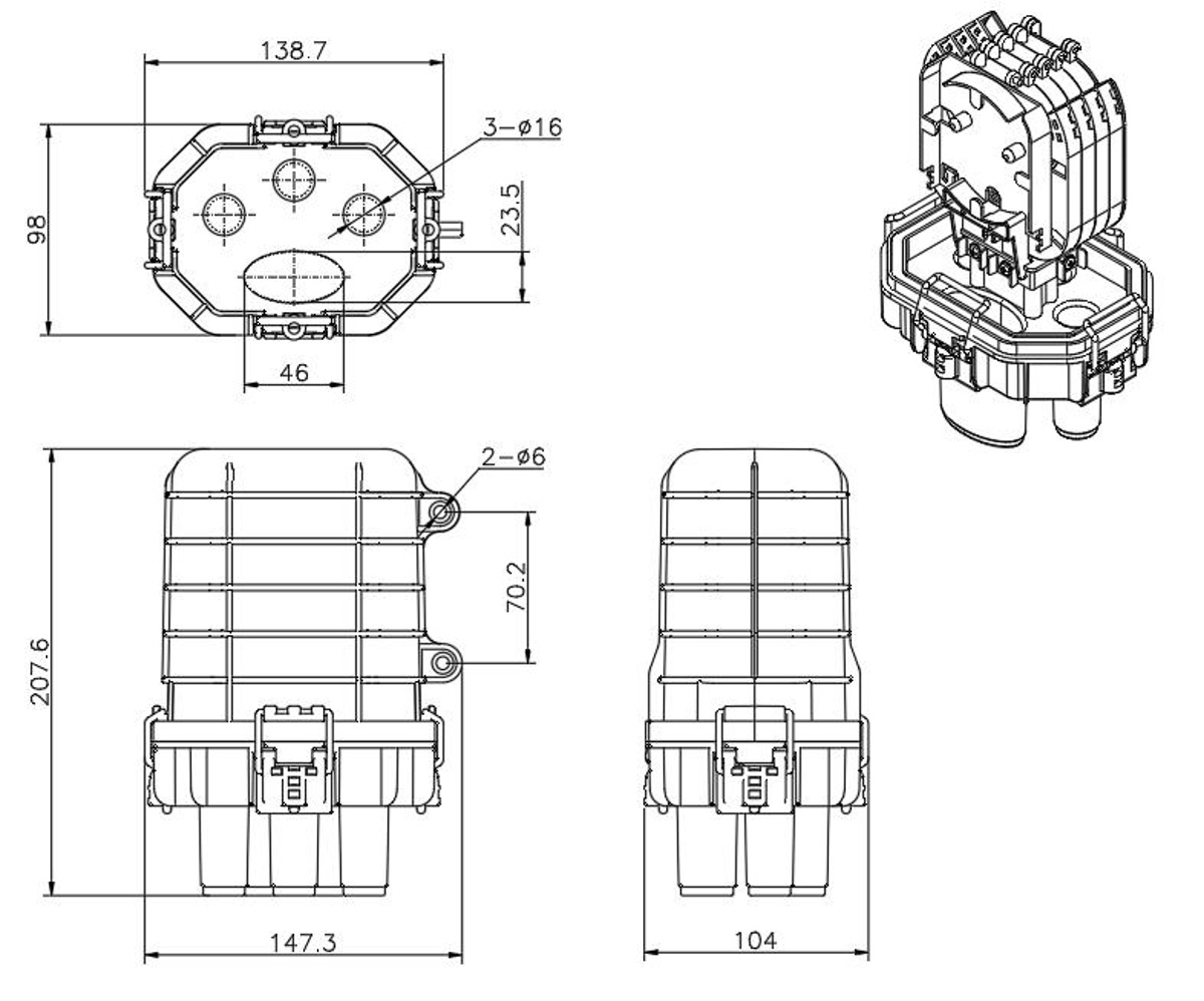 Venkovní optická spojka s krytím IP68, určená pro spojování optických kabelů s kapacitou až (48) vláken v (4) vestavěných kazetách. Součástí balení jsou teplem smrštitelné bužírky a stahovací pásky. TechnicVíce