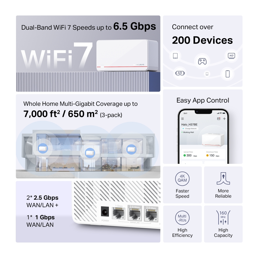 Halo H37BE funguje jako jednotný systém, který zajišťuje silný Wi-Fi signál v každém koutě vašeho domova a poskytuje neuvěřitelně rychlou a stabilní síť. Přerušování připojení a ukládání do vyrovnávací paměti se stanou minulostí. Klíčové vlastnosti - Více