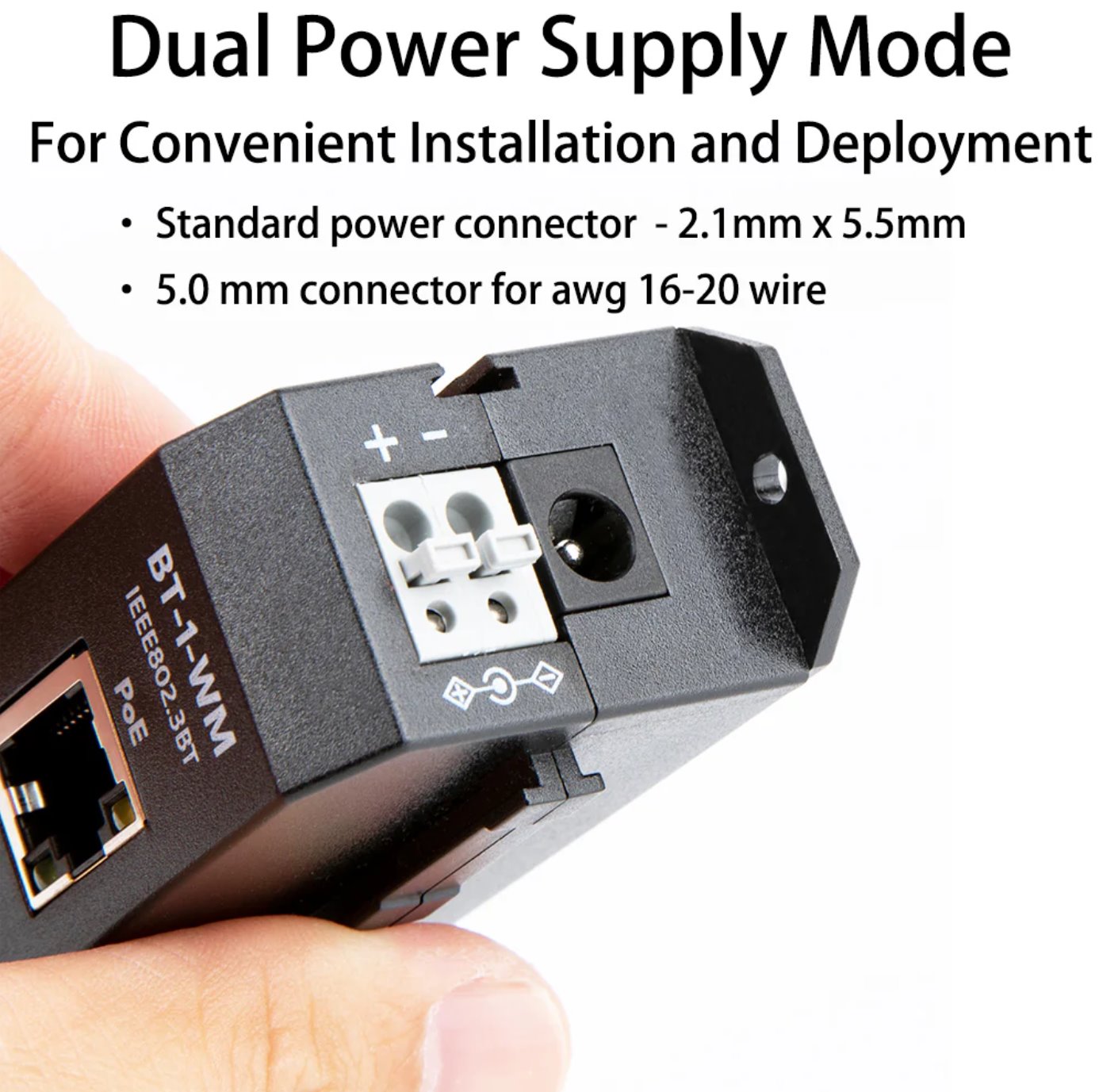 Injektor není vybaven napěťovým měničem, výstupní napětí je shodné se vstupním a je schopen dodat výkon až 90 W. Proudové omezení na port je max. 1.61 A. Napájení je možné pomocí standardního DC konektoru 5.5 / 2.1mm nebo pomocí svorkovnice, která pojme vodiče o průřezu AWG16-20.