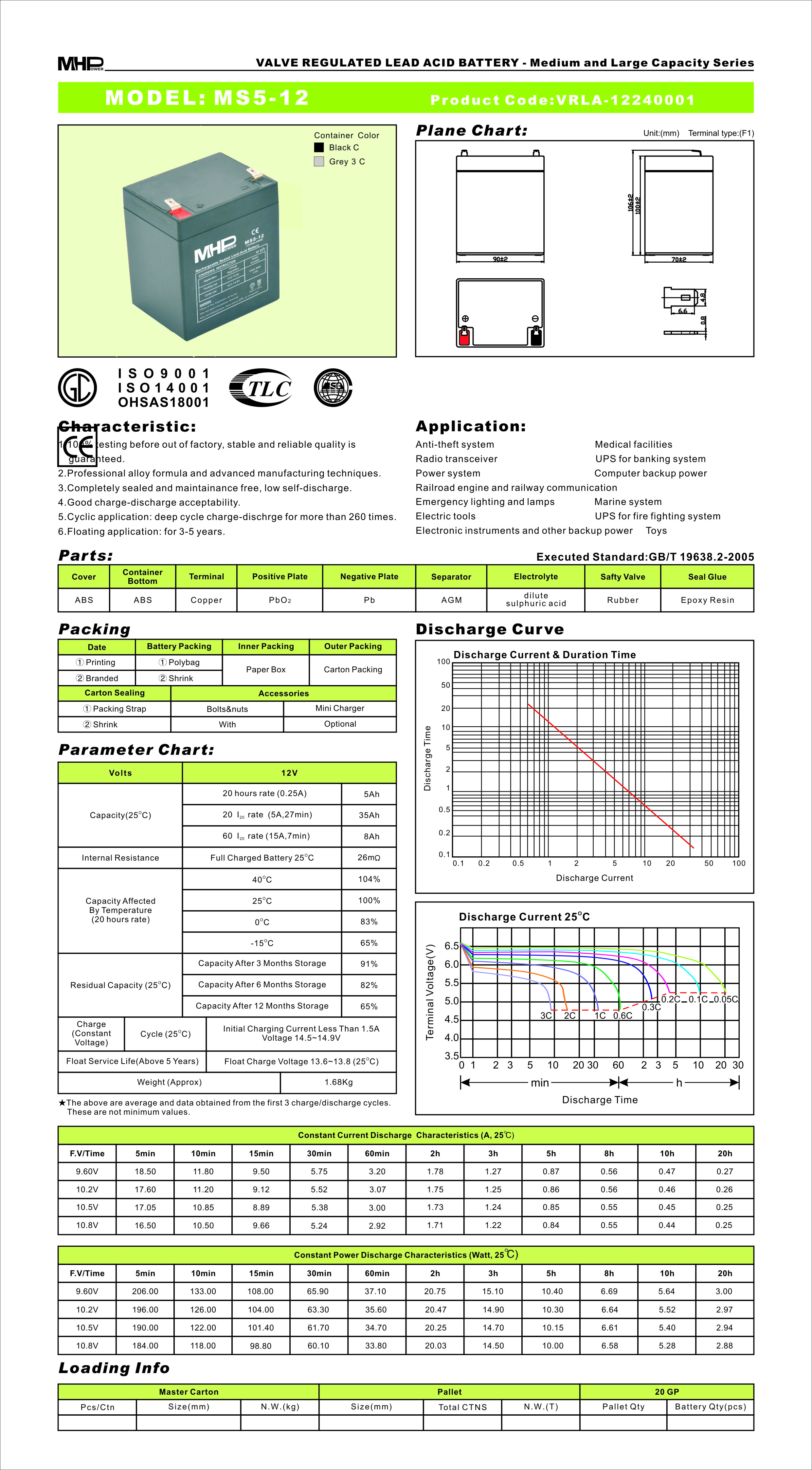 MHPower MS5-12 olověný akumulátor AGM 12V/5Ah, Faston F1 - 4,8mm