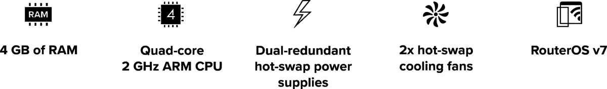 Zařízení je postavené pro dlouhodobý provoz s minimálními náklady. Duální hot-swap napájecí zdroje a vyměnitelné ventilátory zvyšují dostupnost, zatímco spotřeba pouhých 123 W při plné konfiguraci s optikami šetří energii i chlazení. Operační systém RouterOS v7 (level 6) přináší osvědčené prostředí, pokročilé funkce a snadnou správu. Ideální volba pro menší datacentra, enterprise podlahy i edge nasazení, kde je potřeba maximální rychlost v omezeném prostoru.