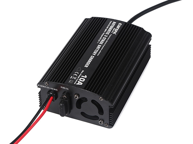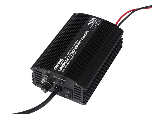 Nabíječka 12V/10A spínaná pro Pb aku, CARSPA ENC1210. Kvalitní a výkonná nabíječka olověných akumulátorů značky CARSPA s max. nabíjecím proudem 10A. Nabíječka Carspa obsahuje 3 automatické fáze nabíjení, ochranu proti přepólování, zkratu na výstupu, pVíce