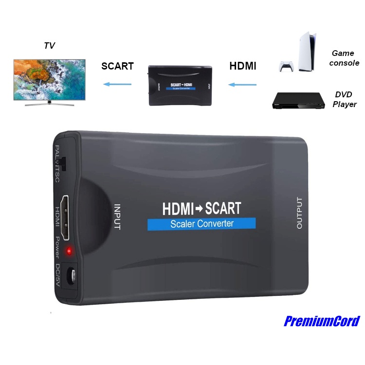 PremiumCord Převodník HDMI na SCART 1080P s napájecím zdrojem 230V Umožní připojit HDMI signál do staršího TV s konektorem SCART. - Adaptér HDMI na SCART - Vstup - HDMI 1.3 female - Výstup - SCART female - Podporuje rozlišení 1080p (60 Hz) na HDVíce
