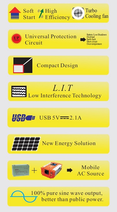 - Čistý sinusový výstup (THD<2%)