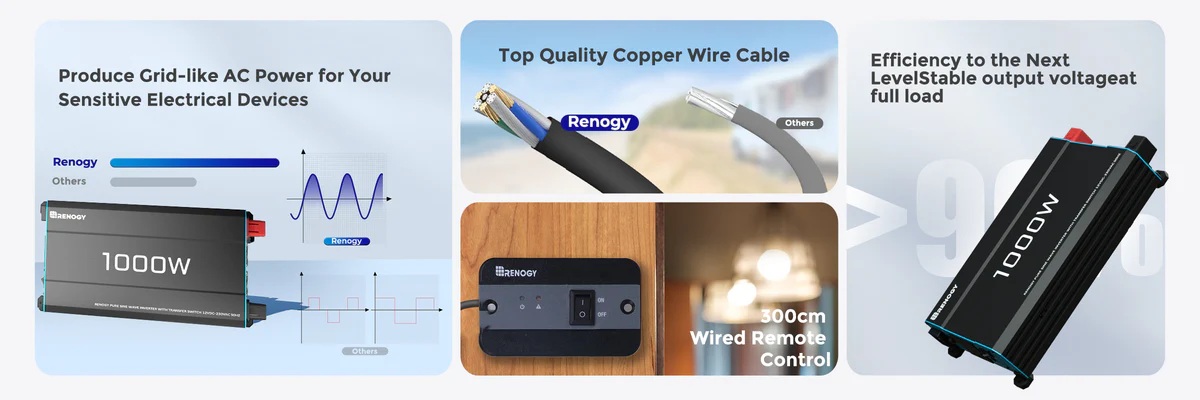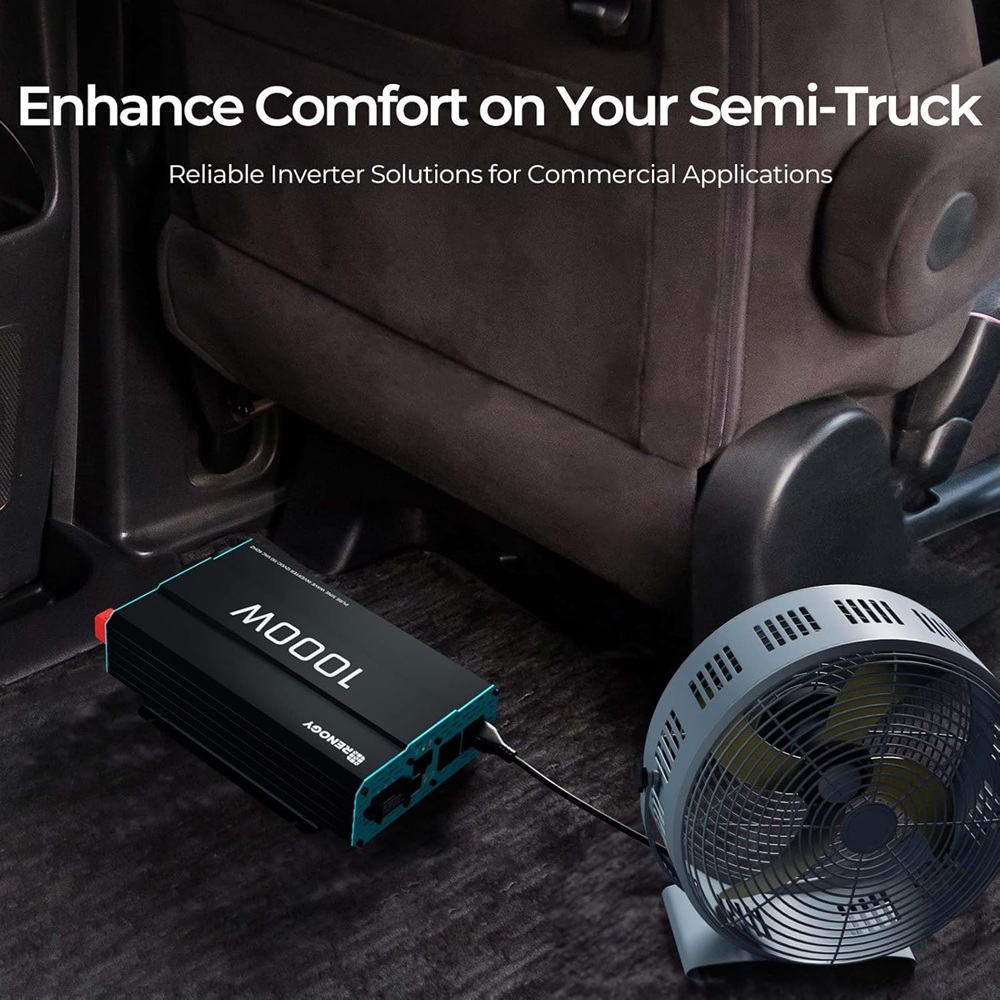 Měnič Renogy poskytuje kontinuální výkon 1000W s možností krátkodobého zatížení až 2000W, což umožňuje napájet i náročnější spotřebiče v karavanu. Pracuje na principu přeměny 12V stejnosměrného proudu z baterie na 230V střídavý proud s frekvencí 50Hz. VýsVíce