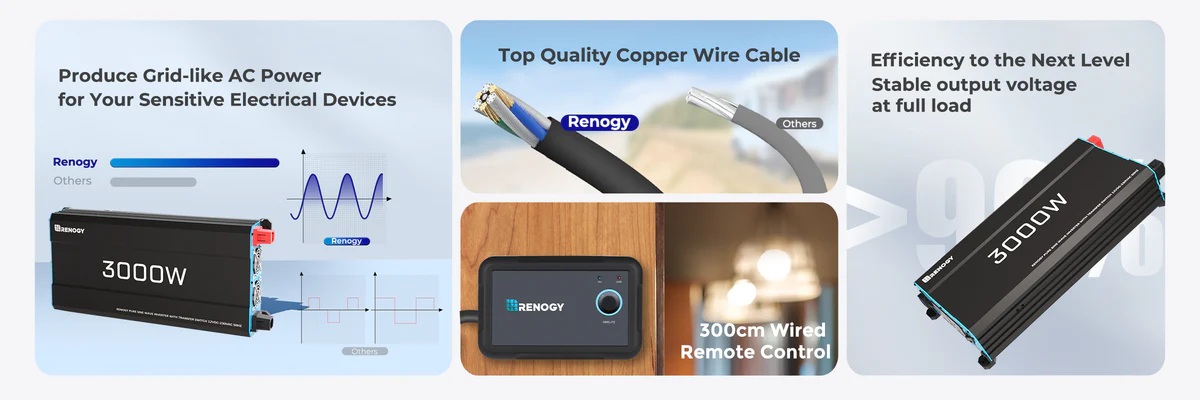 Měnič Renogy poskytuje kontinuální výkon 3000W s možností krátkodobého zatížení až 6000W, což umožňuje napájet i náročnější spotřebiče v karavanu. Pracuje na principu přeměny 12V stejnosměrného proudu z baterie na 230V střídavý proud s frekvencí 50Hz. VýsVíce