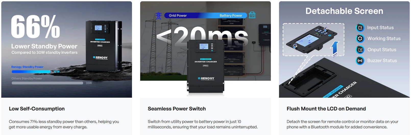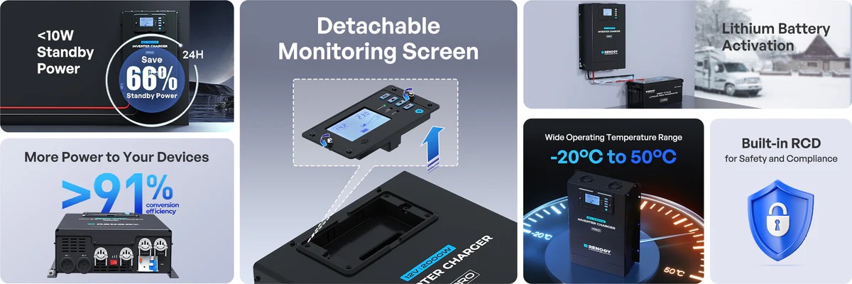 Jednotka je vybavena inovativním odnímatelným ovládacím panelem pro pohodlné monitorování systému a podporuje vzdálený přístup prostřednictvím aplikace Renogy ve spojení s volitelným modulem Bluetooth BT-2 (prodává se samostatně). Vestavěný proudový chránič zvyšuje bezpečnost uživatelů bez nutnosti použití dalších zařízení.