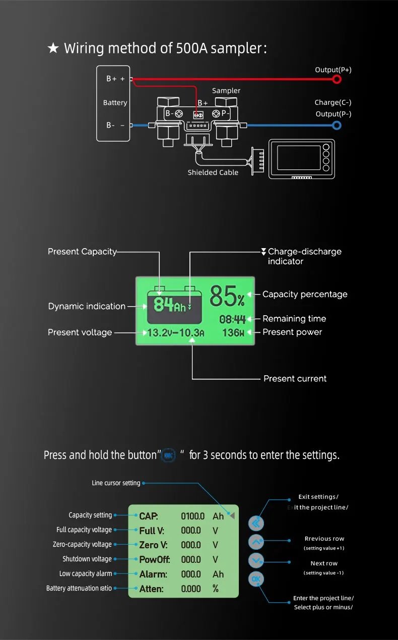 - Nastavitelné sledování kapacity: 0,1 až 9 999 Ah