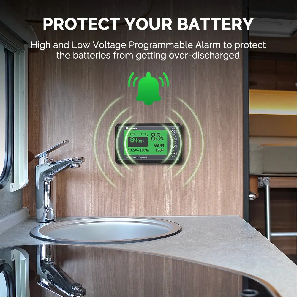 Díky funkcím alarmu při vysoké i nízké kapacitě spustí monitor RENOGY Smart Shunt výstrahu, přičemž začne blikat podsvícení a hodnota napětí, aby zabránil hlubokému vybití baterie.