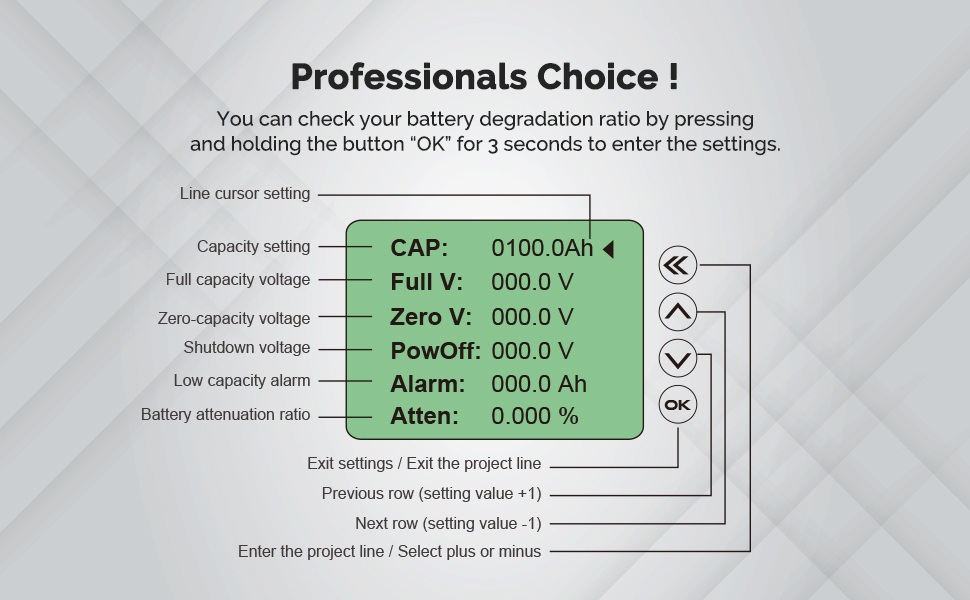 - Přednastavená hodnota kapacity: 0,1–9999,0 AH