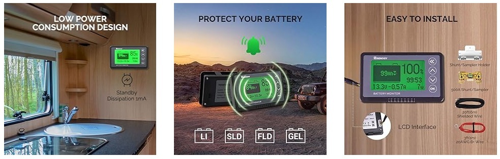 Jedná se o univerzální monitor baterií, který můžete používat s napětím od 10 V do 120 V a až do 500 A. Monitor baterií Renogy je navržen pro sledování výkonu většiny typů baterií. Jeho vysoce přesná měření eliminují dohady o používání baterií aVíce