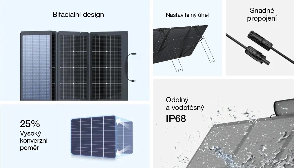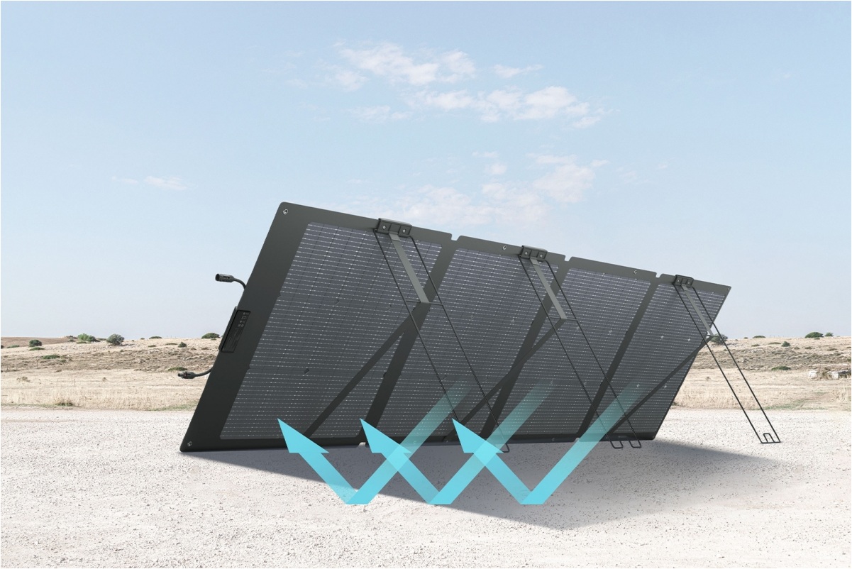 Panel přináší možnost získání více energie ze slunečního záření, a to díky vestavěnému ukazateli úhlu dopadu slunečních paprsků a integrovanému stojanu, kterým lze naklápět panel v rozsahu 30° až 60° podle aktuální pozice slunce. Panel je možné snadno připojit například k bateriové stanici EcoFlow a maximálně využít energii slunečních dnů.