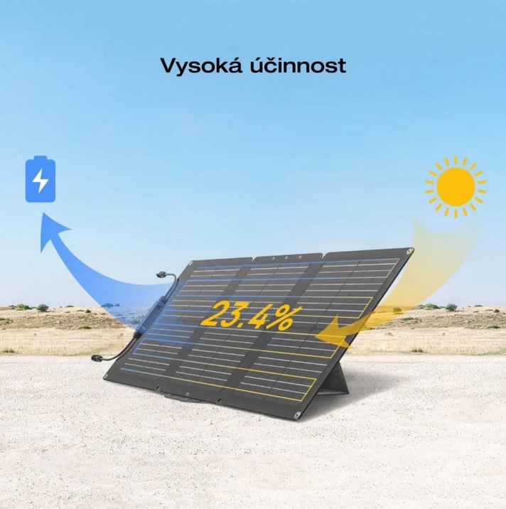Solární panel - vysoce efektivní monokrystalické křemíkové články, výkon 60 W, voděodolné, skladné a polohovatelné. Se solárním panelem EcoFlow o výkonu 60 W nemusíte mít obavy z míst, kde není elektrická zásuvka. Panel se vyznačuje vysokou efektivitou a Více