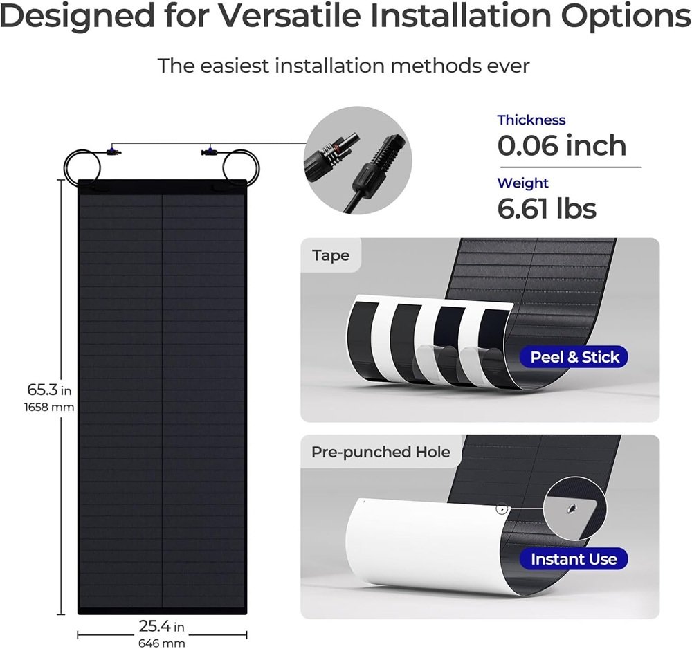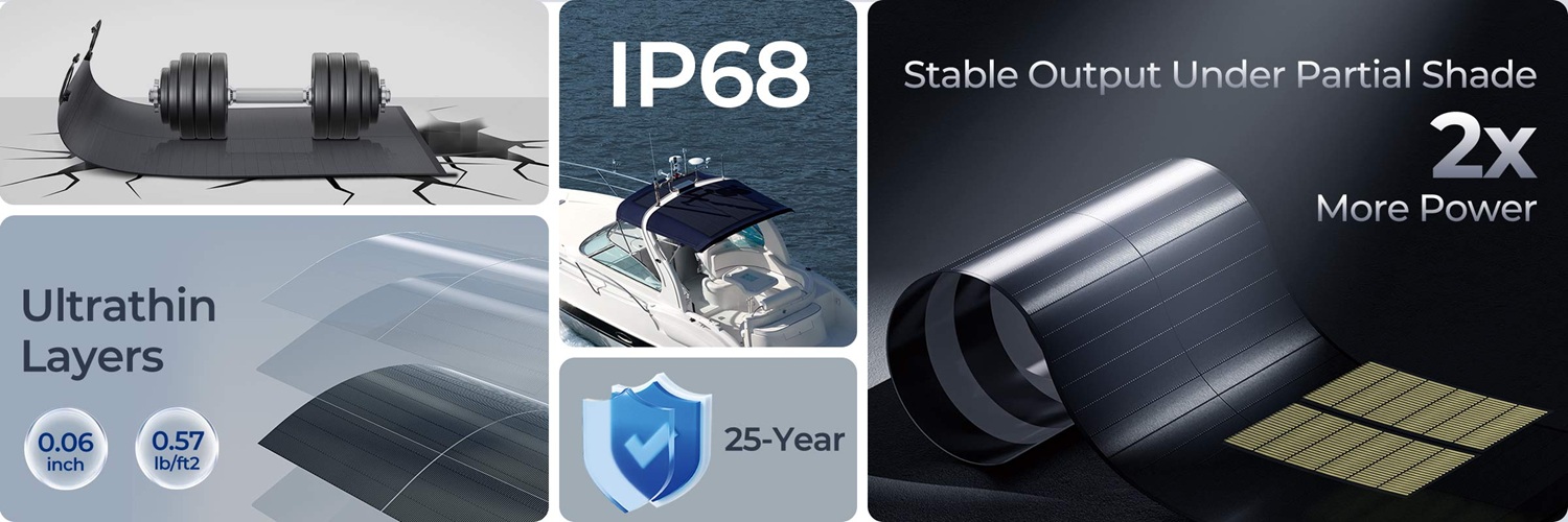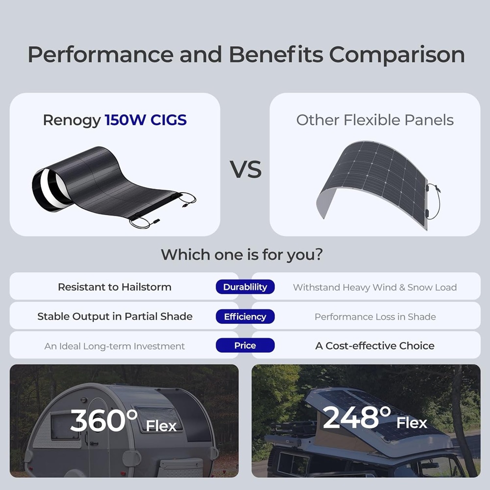 Renogy flexibilní solární panel 150W CIGS je díky svým vlastnostem perfektní pro Vaše dovolené v karavanu, obytném voze a lodi. Vlastnosti produktu: - 150W CIGS panel - Nepřekonatelná odolnost proti hurikánům a krupobití - Extrémní odolnost vůči nárVíce
