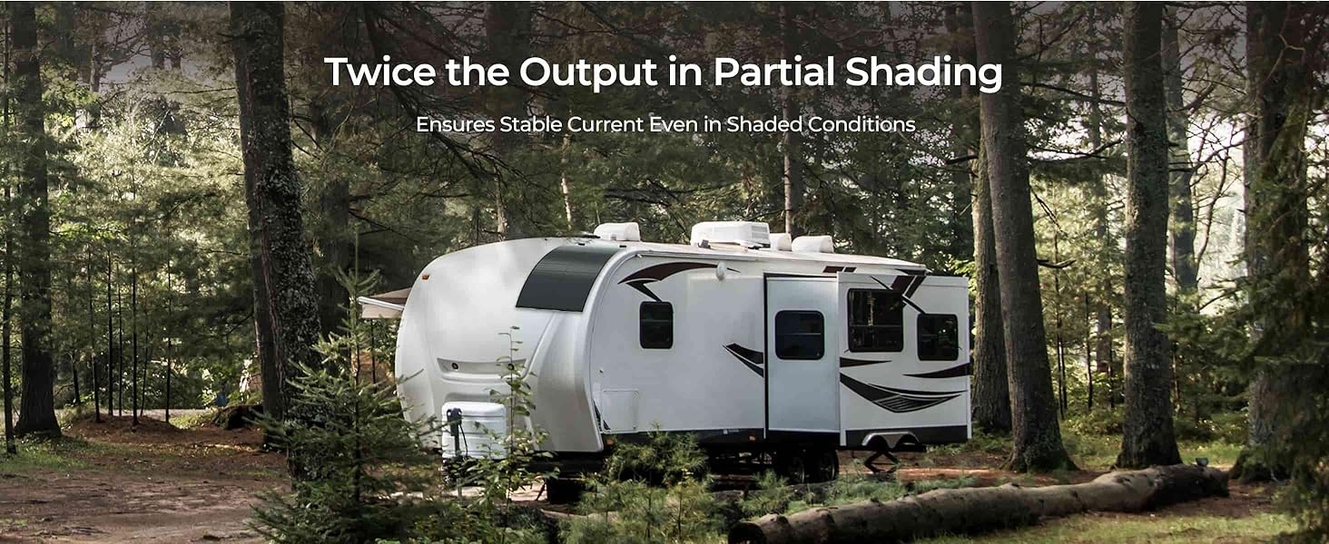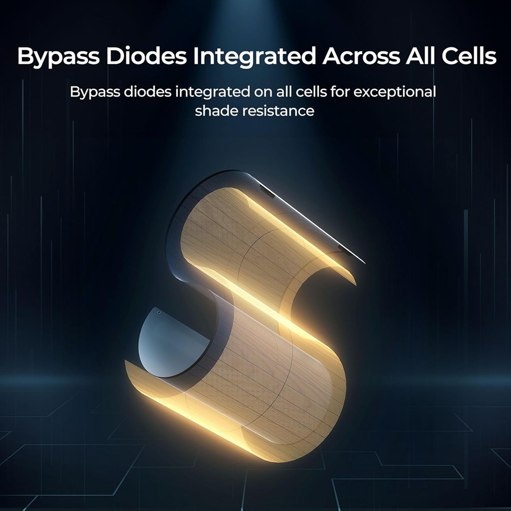 - Bypass diody integrované ve všech solárních článcích zajišťují stabilní proud i za zastíněných podmínek (dokonce i při zastínění víc než 90%)