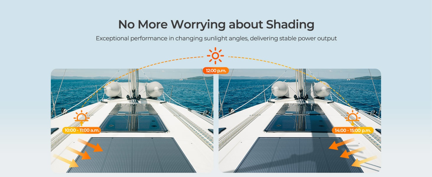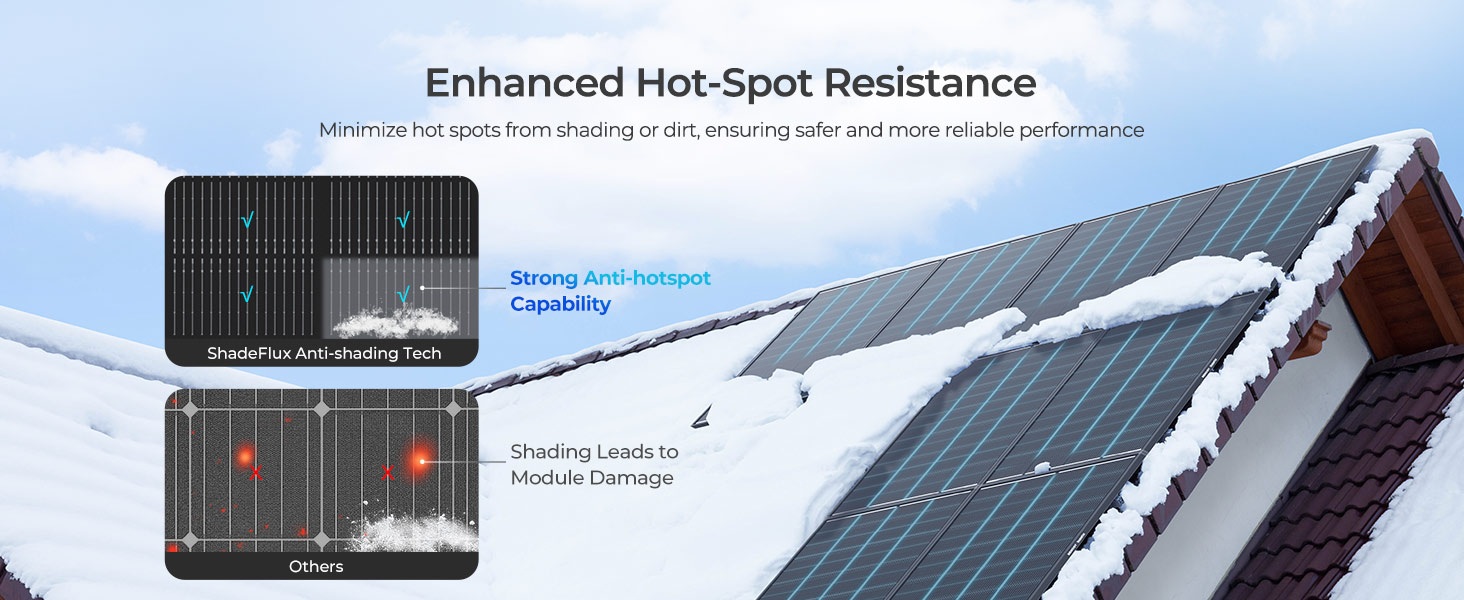 - Pokročilá technologie Shadowflux: Díky technologii Shadowflux minimalizuje panel ztráty výkonu při částečném stínění. To znamená, že váš panel bude efektivní i v případě, že je parkováno pod stromy nebo v jiných částech s omezeným slunečním zářením