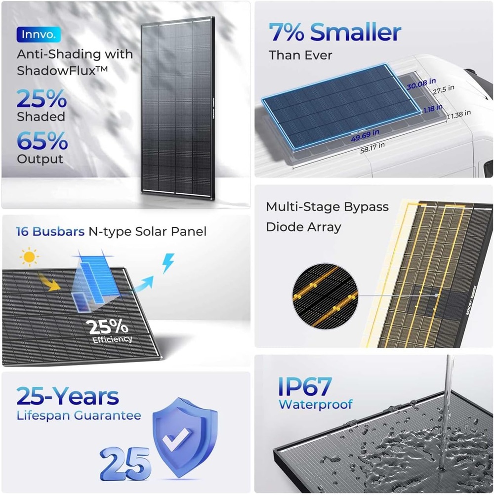 - Vysoce účinné monokrystalické články: S využitím monokrystalických solárních článků, které jsou známé svou vysokou účinností a dlouhou životností, Renogy zajišťuje, že panel poskytne stabilní výkon i za méně ideálních podmínek
