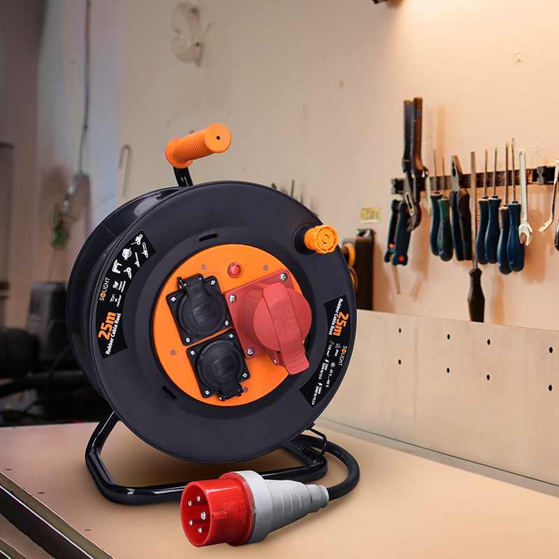 Robustní prodlužovací přívod na bubnu s délkou 25 metrů, jednou zásuvkou na 400 V a dvěma zásuvkami na 230 V je ideální volbou pro napájení stavebních strojů, profesionálního nářadí nebo dílenského vybavení. Díky kabelu z měkčené pryže a krytí IP44 je vhodný i do náročných podmínek na stavbách nebo v průmyslu. Samovolnému navíjení brání integrovaná aretační brzda.