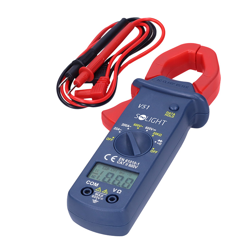 Digitální multimetr s max. zobrazením 2000 hodnot a indikací slabé baterie. Nabízí automatické vypnutí po 15 minutách nečinnosti a akustickou výstrahu před vypnutím. Měří DC napětí (600V), AC napětí (True-RMS, 600V), AC proud (20A - 200A), odpor (20k?), a nabízí test spojitosti s bzučákem (hranice sepnutí <50?). Test diod, funkce Data Hold pro uložení hodnoty na displeji. Ochrana proti přetížení (250V DC/AC RMS). Napájení: 2x AAA baterie (součástí balení). Rozměry: 195 × 70 × 35 mm, hmotnost: 172 g. Norma: EN61010-1, CAT II 600V.