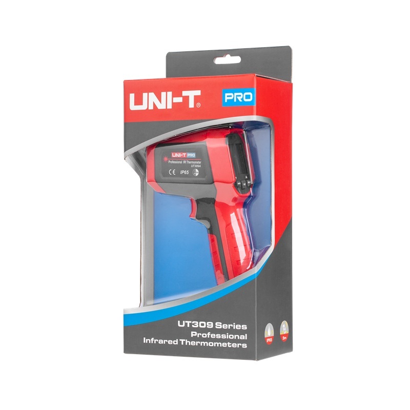 UT309A má fixní emisivitu 0,95 a jeden zaměřovací laser, který indikuje správné zaměření teploměru. Poměr vzdálenosti k průměru měřeného povrchu je u tohoto přístroje 10 :1. Indikaci přednastavených funkcí a naměřených hodnot teploty zajišťuje vysoce kontrastní LCD černobílý displej a přesažení hraničních hodnot teploty indikují LED diody ( překročení horního limitu červená a spodního limitu modrá ).