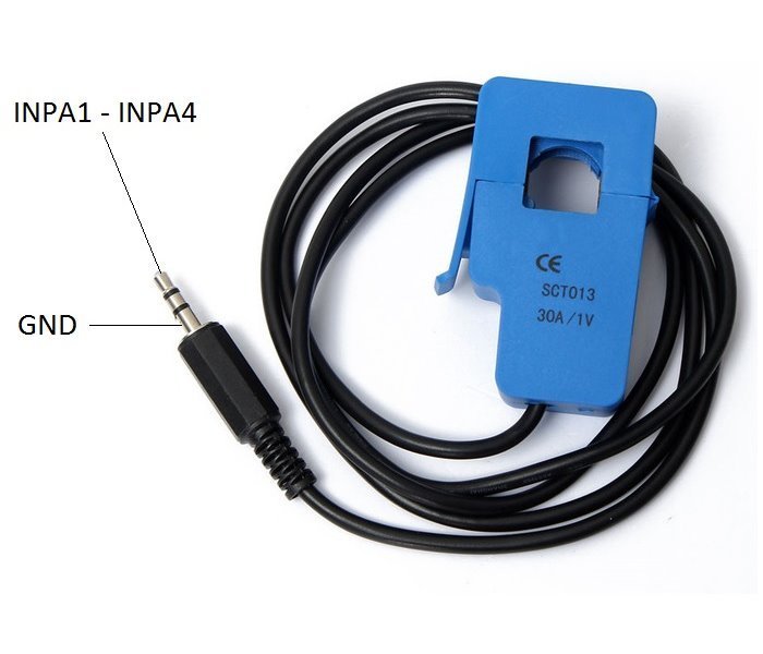 Měření je nutné provádět pouze na jednom vodiči, a ne na celém kabelu, kde teče proud oběma směry. Senzor se připojuje na vstupy INPA1-4 a GND pro tyto vstupy. Je dodáván včetně 3,5 mm jack konektoru (samec), který je možné ustřihnout v požadované délce nebo k LAN ovladači připojit 3,5 mm jack konektor (samice) se zapojením viz fotky.