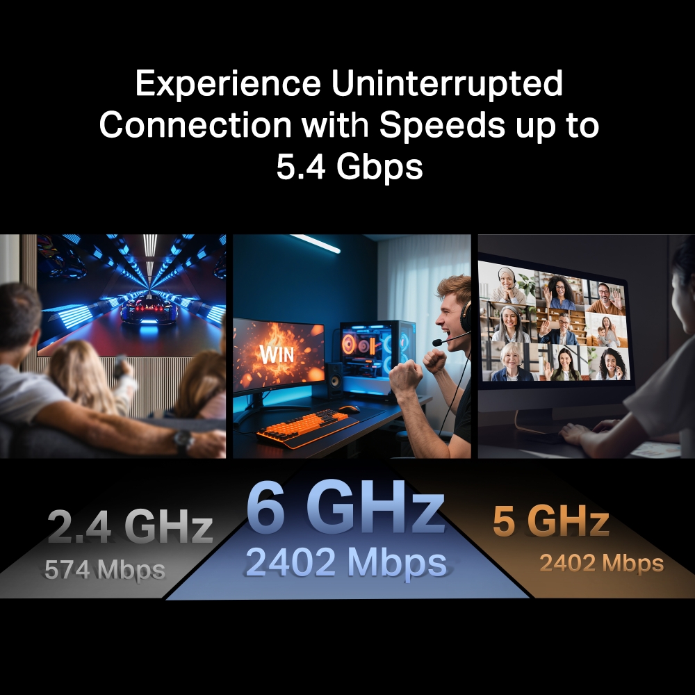 - Třípásmová Wi-Fi 6E s rychlostí 2402 Mb/s (6 GHz / 5 GHz), 574 Mb/s (2,4 GHz)