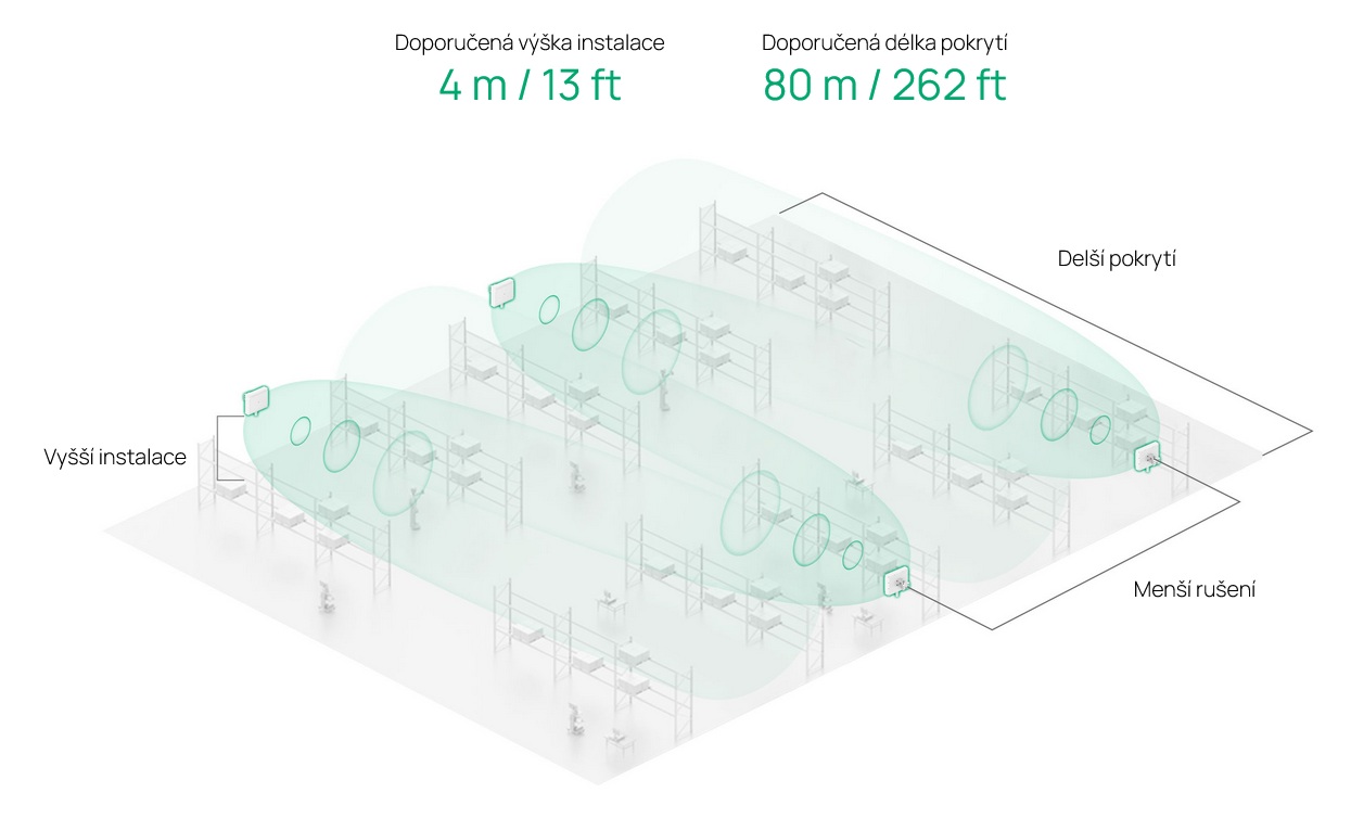 Zařízení je vybaveno 4× vestavěnými dvoupásmovými směrovými anténami s vysokým ziskem, které zajišťují přesné a rozšířené pokrytí. Díky tomu je ideální pro venkovní prostory, rozsáhlé sklady nebo místa s vysokými nároky na sílu signálu. Směrové antény umožňují optimalizovat přenos dat a přinášejí spolehlivou konektivitu i na větší vzdálenosti, což ocení jak firmy, tak rezidenční projekty.