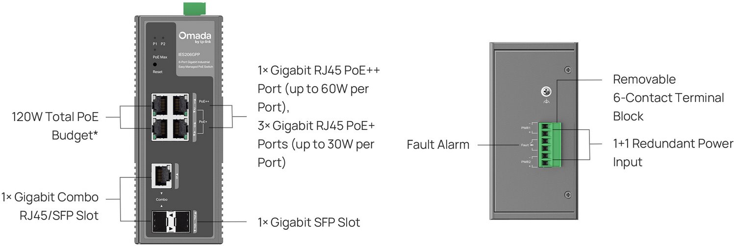 Omada 6portový gigabitový průmyslový Easy Managed Switch nabízí 4× gigabitové RJ45 porty, včetně 1× PoE++ a 3× PoE+, které umožňují napájet náročná síťová zařízení přímo přes síťový kabel. Kombinovaný gigabitový RJ45/SFP slot a samostatný SFP slot zajišťuVíce