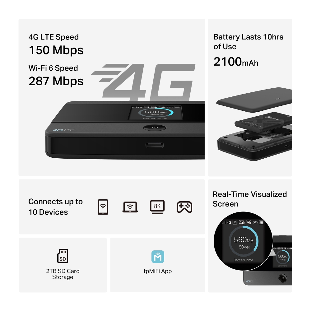 Slot pro microSD kartu s podporou až 2 TB umožňuje proměnit zařízení v přenosný úložný hub – ideální pro sdílení fotografií, dokumentů i médií bez cloudových služeb. Intuitivní aplikace tpMiFi poskytuje snadnou kontrolu nad všemi funkcemi, od nastavení datových limitů po správu připojených zařízení. Kombinace chytré vizualizace dat, rozšiřitelného úložiště a maximálně jednoduchého ovládání činí z tohoto řešení dokonalý nástroj pro moderní mobilní připojení.