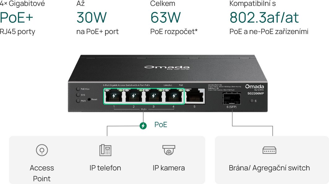 - 5 gigabitových RJ45 portů (4× PoE+) a 1 gigabitový SFP slot