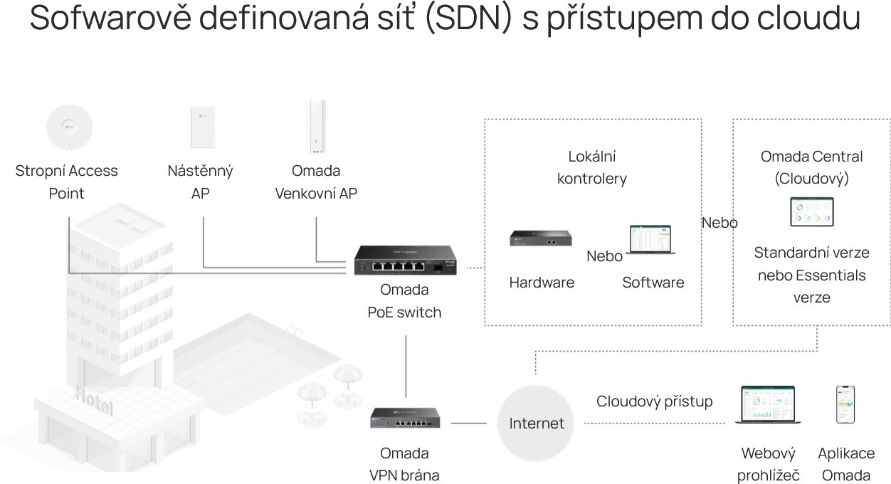 - Centralizovaná cloudová správa a podpora web, CLI, SNMP, RMON