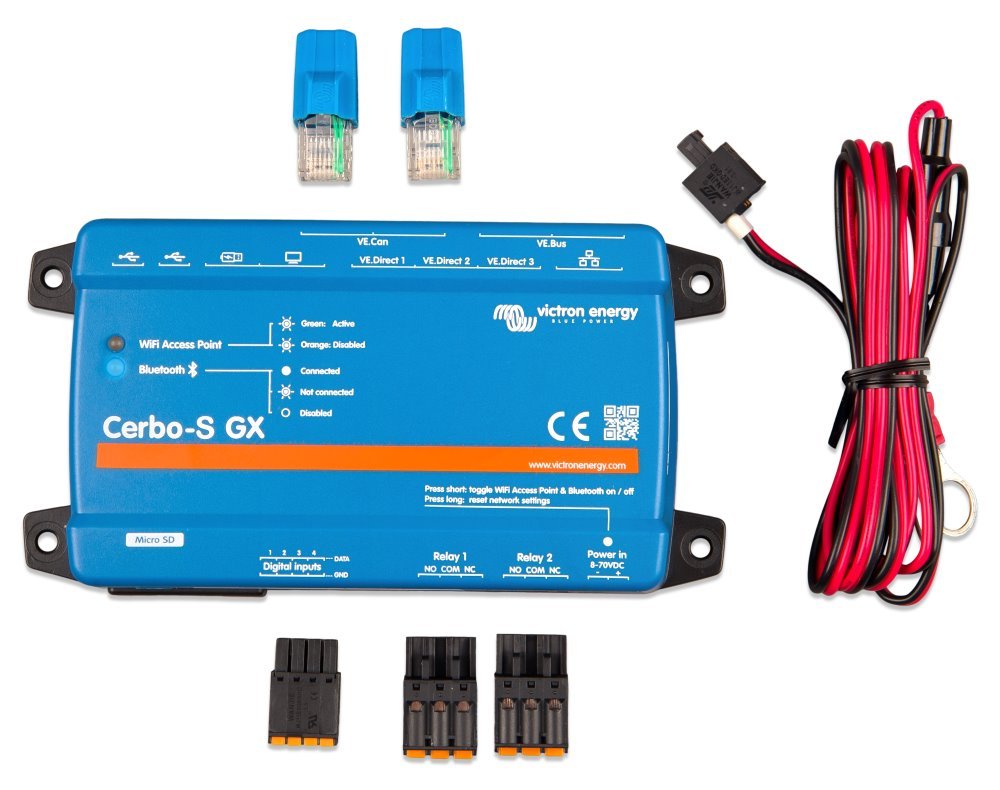 Zařízení Cerbo-S GX je nyní optimalizováno tak, aby splňovalo a dokonce převyšovalo požadavky odborníků na instalaci. Toto zařízení se jednoduše montuje na nosnou lištu DIN (pomocí DIN35 adapter small, který není součástí dodávky) a jeho samostatný dotykový displej lze přišroubovat přímo na palubní desku, takže není zapotřebí vyřezávat vhodný otvor (jak tomu bylo u zařízení Color Control GX), kromě toho, zařízení se připojuje pouze jedním kabelem, což znamená, že už nemusíte táhnout k palubní desce více kabelů. Nová funkce Bluetooth umožňuje rychlé připojování a konfigurování prostřednictvím naší aplikace VictronConnect.