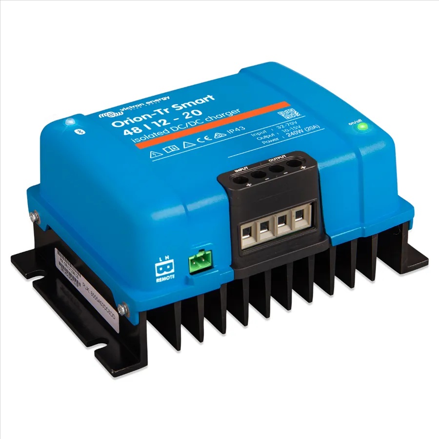 Orion-Tr Smart DC-DC nabíječka 48/12-20 (240 W) od společnosti Victron Energy je vysoce efektivní a plně programovatelné řešení pro nabíjení 12V baterií z 48V systémů. Nabíječka je vybavena galvanickou izolací, adaptivním třístupňovým algoritmem nabíjení Více